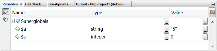 Figure 7 The values of variables $a and $s are displayed in the Variables window